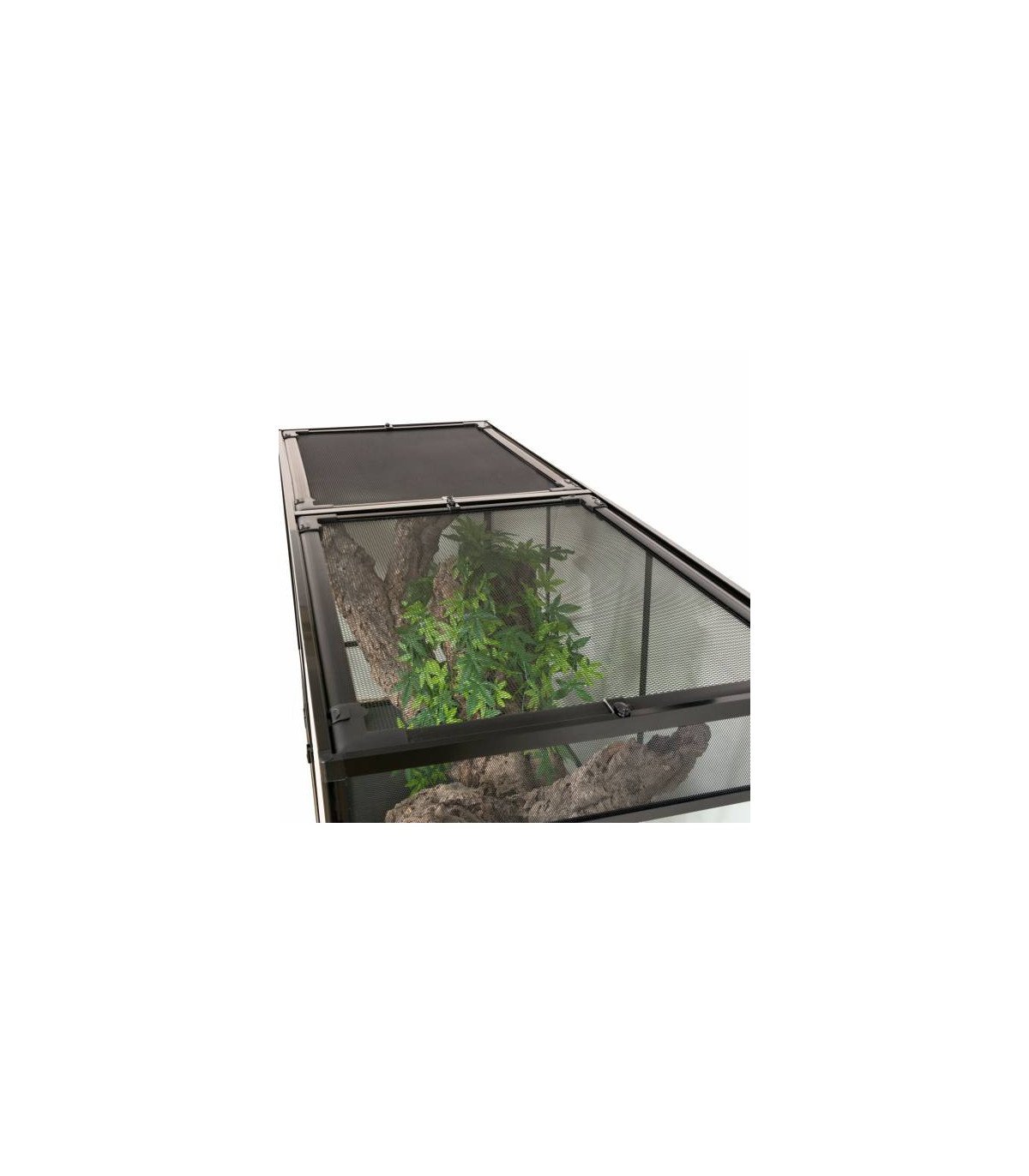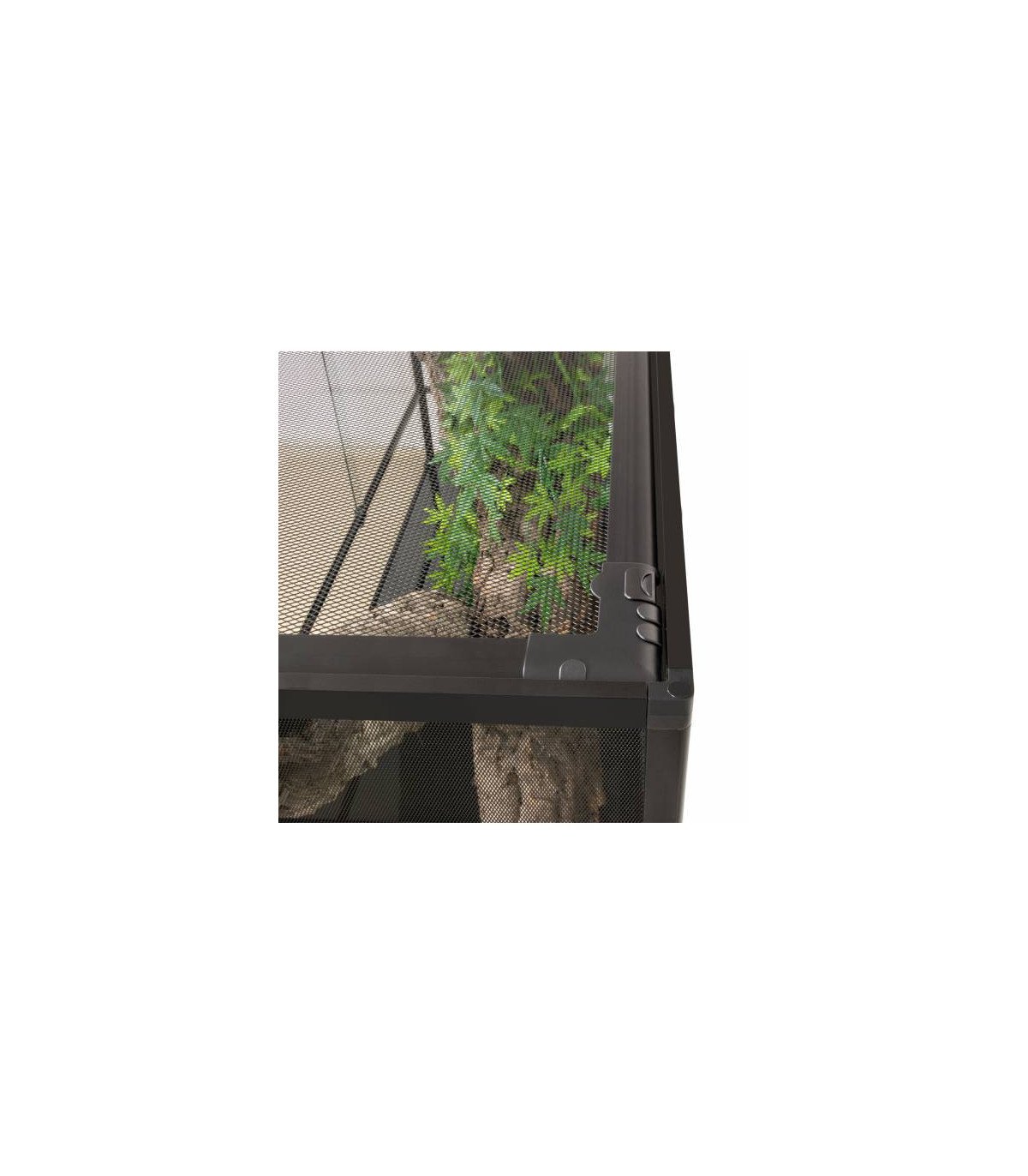 Son fond de 18 cm est étanche et permet de l’utiliser aussi bien en paludarium qu’en terrarium tropical. Des ventilations basses et hautes en aluminium sont judicieusement disposées afin de maximiser le flux d’air à l’intérieur de l’habitat. Des passe-câbles facilitent l’installation des équipements électriques à l’intérieur du terrarium.